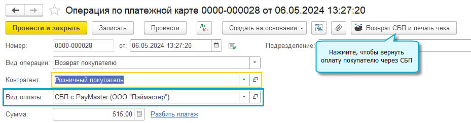 Добавлена возможность вернуть оплату покупателю через Систему быстрых платежей (СБП), когда оплата получена также через СБП.