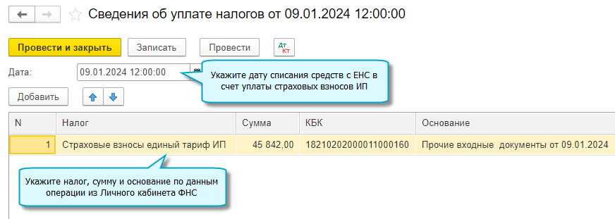 Если не используется сервис 1С-Отчетность, то сведения об уплате страховых взносов требуется ввести вручную.