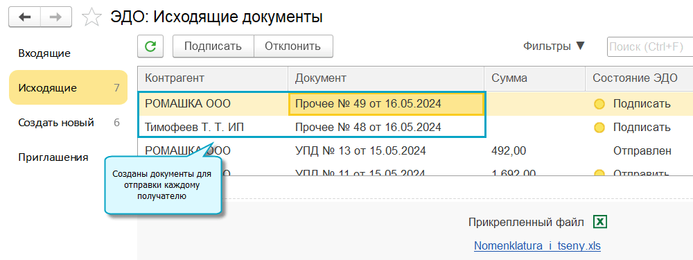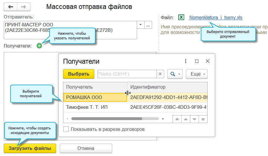 Добавлена возможность массового создания и отправки электронных документов. Применяется, когда требуется отправить один файл нескольким получателям, например, разослать прайс-лист.