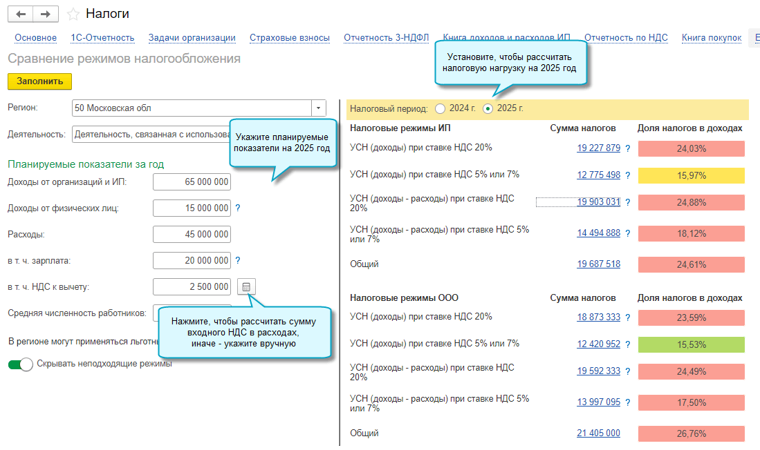 В расчете налогов за 2025 год для ООО на общей системе налогообложения учитывается повышение ставки налога на прибыль до 25 %, для ИП - расчет НДФЛ по прогрессивной шкале с 01.01.2025 будет реализован в следующих версиях.