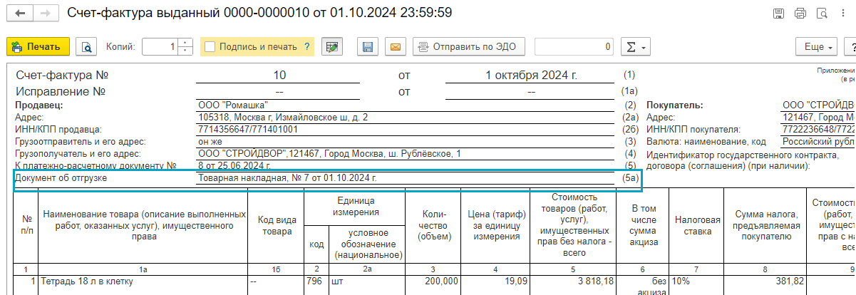 Начиная с 01.10.2024 в строке 5а печатной формы счета-фактуры заполняется наименование документа отгрузки:
