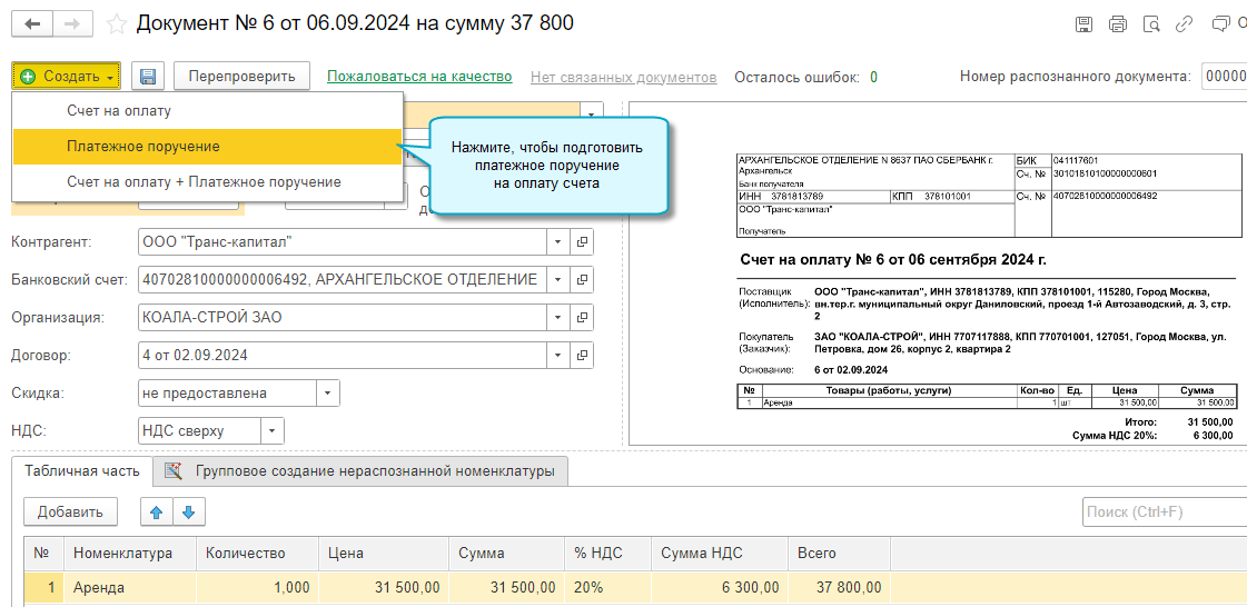 Добавлена возможность создать платежное поручение на оплату счета поставщика сразу после его распознавания. Создать платежное поручение можно как отдельно, так и одновременно со счетом поставщика.