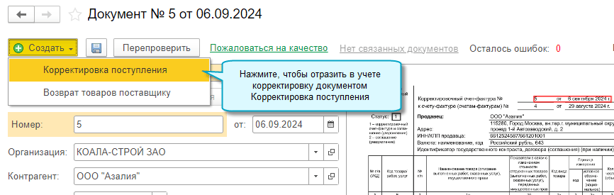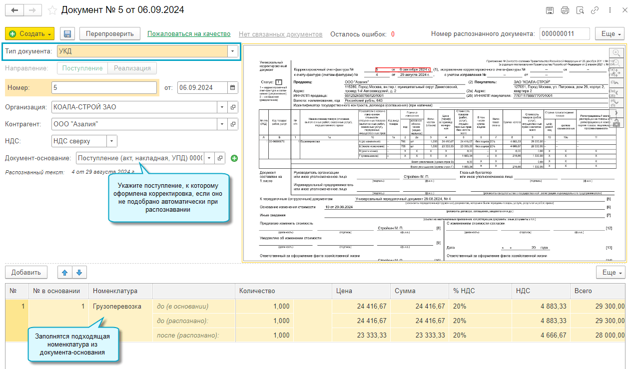 Добавлена возможность создать документы Корректировка поступления или Возврат товаров поставщику по распознанному универсальному корректировочному документу (УКД) поставщика.