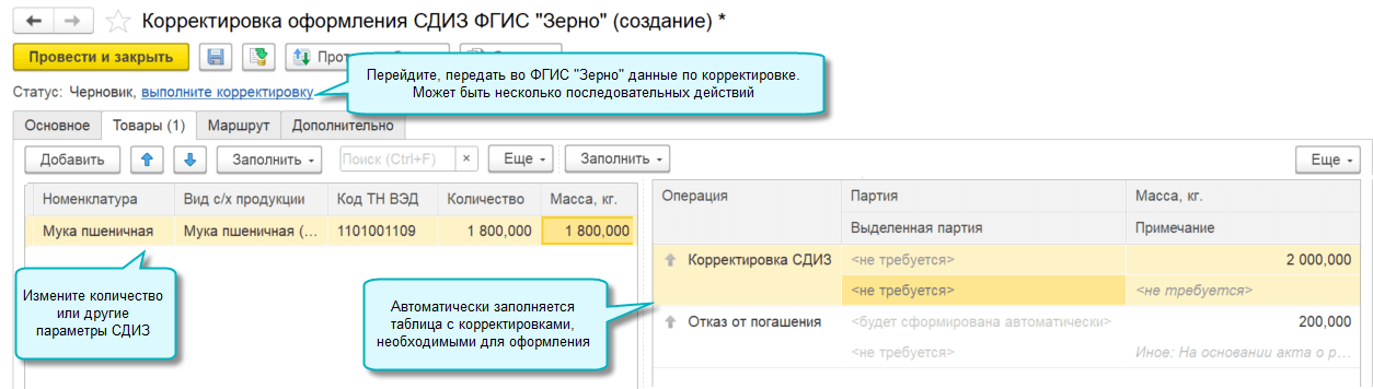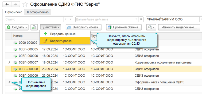 - из формы документа Оформление СДИЗ ФГИС "Зерно" командой Еще – Создать корректировку оформления СДИЗ;