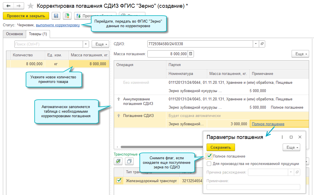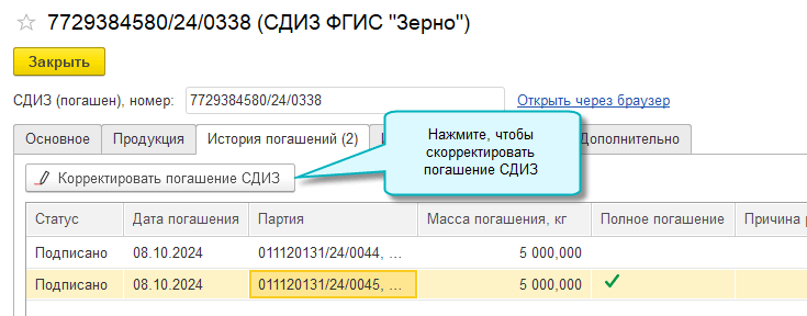 Корректировку Погашения СДИЗ также можно оформить из списка Погашение СДИЗ ФГИС "Зерно" по кнопке Действия – Корректировка.