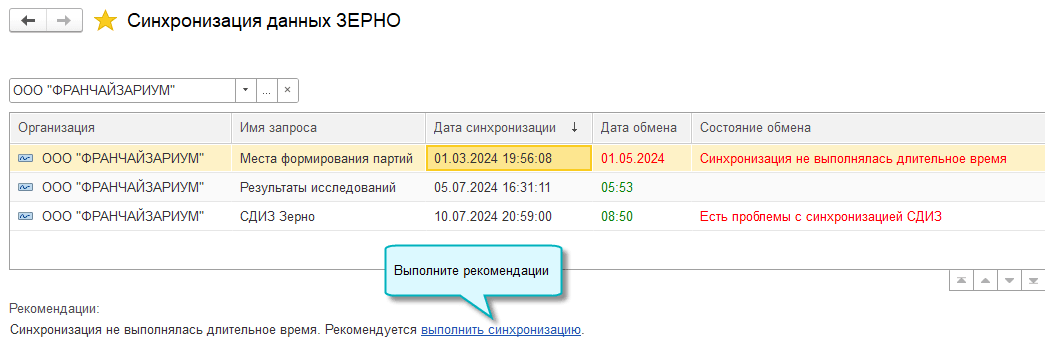 Даты синхронизации сохраняются в разрезе организации и вида запроса. Также в регистре сохраняется состояние обмена. В случае ошибок рекомендуются действия по их исправлению.