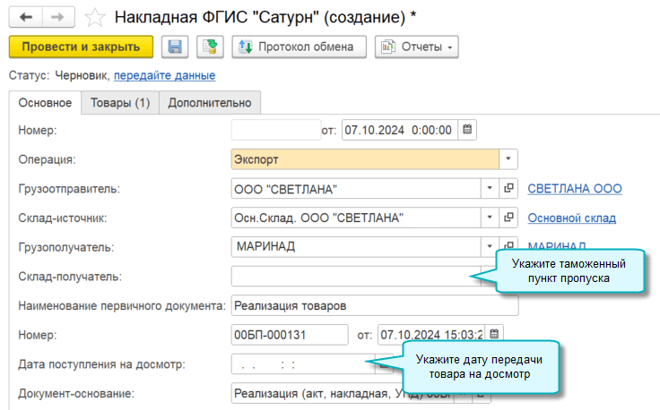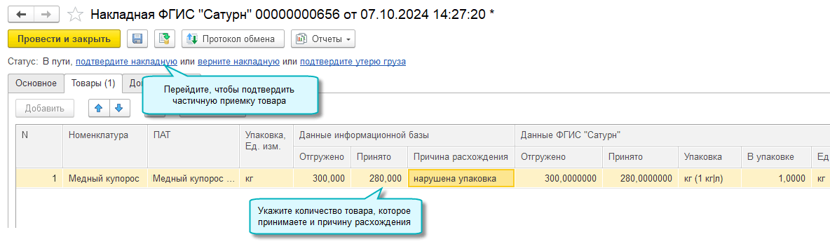 Для накладных ФГИС "Сатурн" поддержаны операции частичной приемки, возврата груза, приемки возвращаемого груза.
