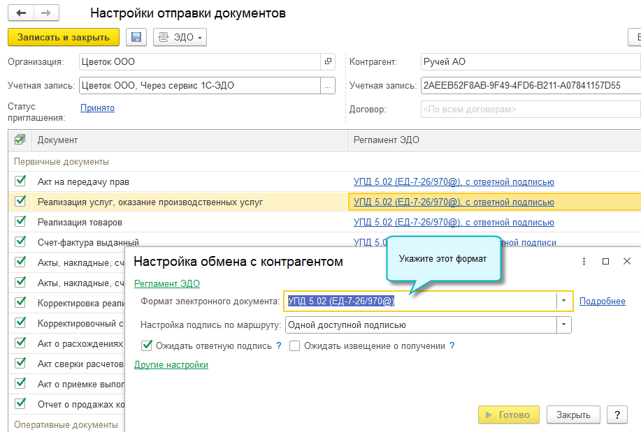 Чтобы при получении от поставщиков УПД и счетов-фактур в таком формате, автоматически создавать документы в учете, выполните аналогичную настройку для получения документов.