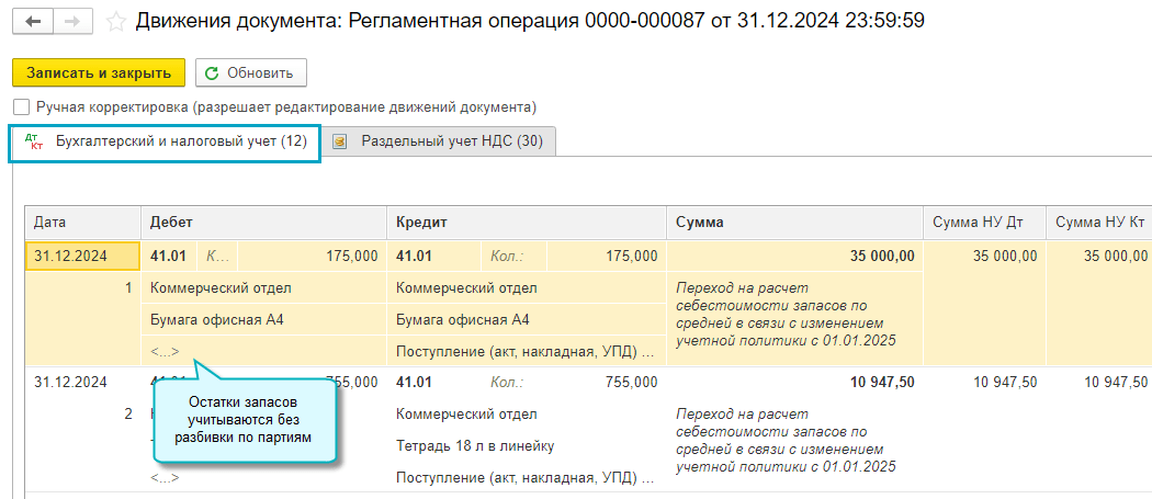 Теперь после перехода от учета запасов по партиям к учету без разбивки по партиям, когда в учетной политике изменяется способ оценки МПЗ с метода ФИФО на оценку по средней, остатки запасов учитываются без партий в бухгалтерском учете, налоговом учете и в регистре по раздельному учету НДС, когда он применяется.