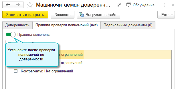 Добавлена возможность контролировать проверку полномочий по машиночитаемой доверенности. У новых поступающих доверенностей правила проверки полномочий выключены. На основании таких доверенностей нельзя подписывать документы. Чтобы использовать доверенность, потребуется включить правила после проверки полномочий.