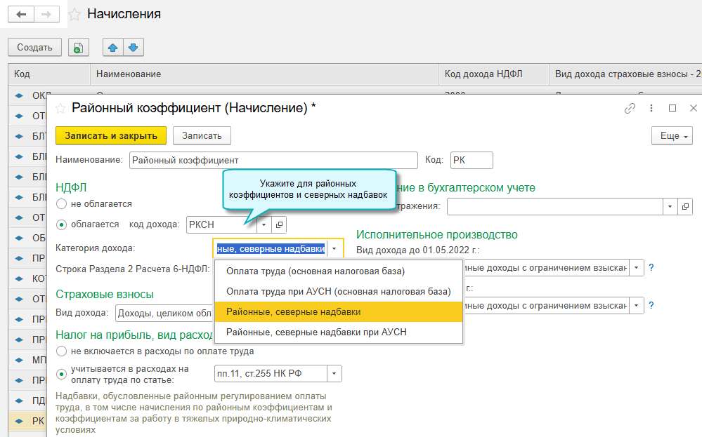 С 2025 года для начислений Районный коэффициент и Северные надбавки добавлены код дохода "РКСН" и категории дохода "Районные, северные надбавки", "Районные, северные надбавки при АУСН".