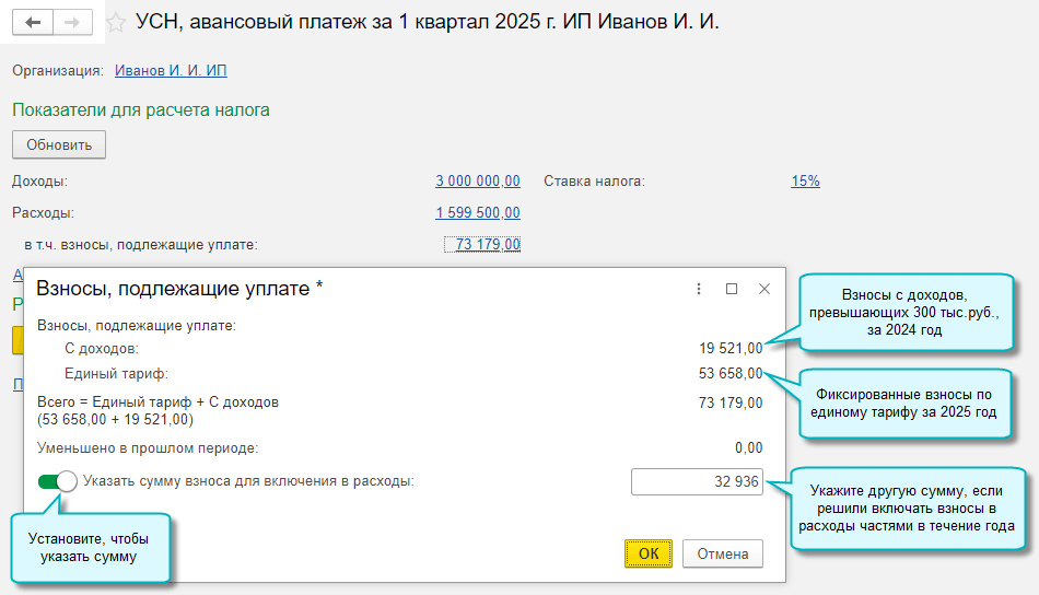 Например, взносы с доходов, превышающих 300 тысяч рублей, за 2024 год со сроком уплаты не позднее 1 июля 2025 г. учитываются в расходах 2025 года.