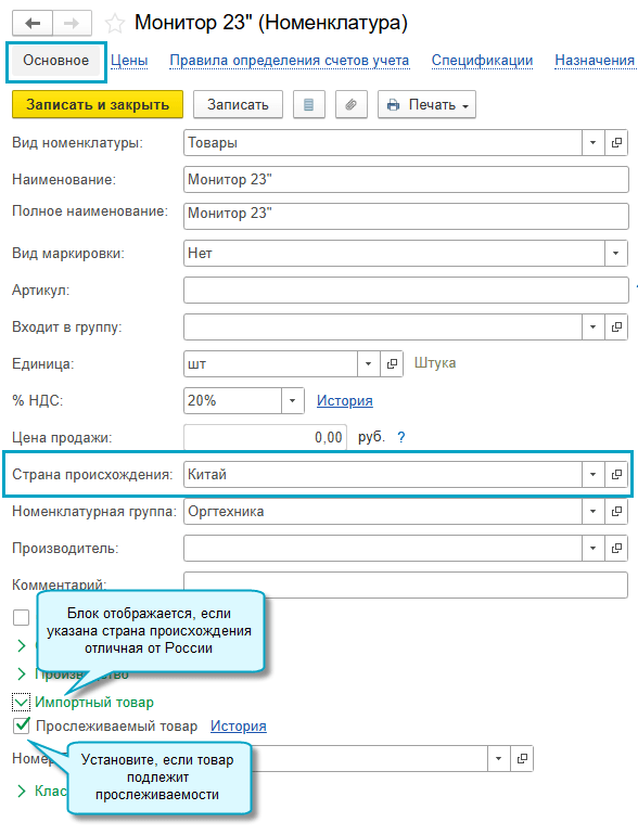 Блок "Импортный товар" теперь отображается, когда для номенклатуры указана страна происхождения отличная от России.