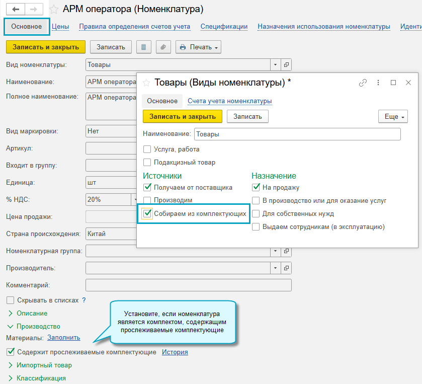 - в блоке "Производство", когда номенклатура собирается, является комплектом, в составе которого есть комплектующие (части), указанные в перечне товаров, подлежащих прослеживаемости.