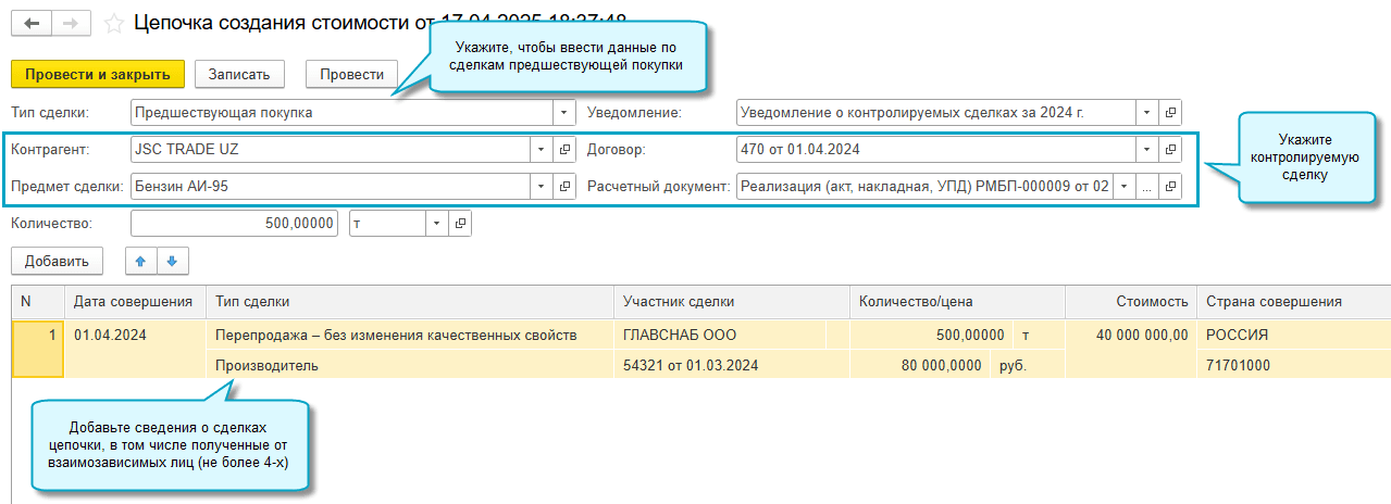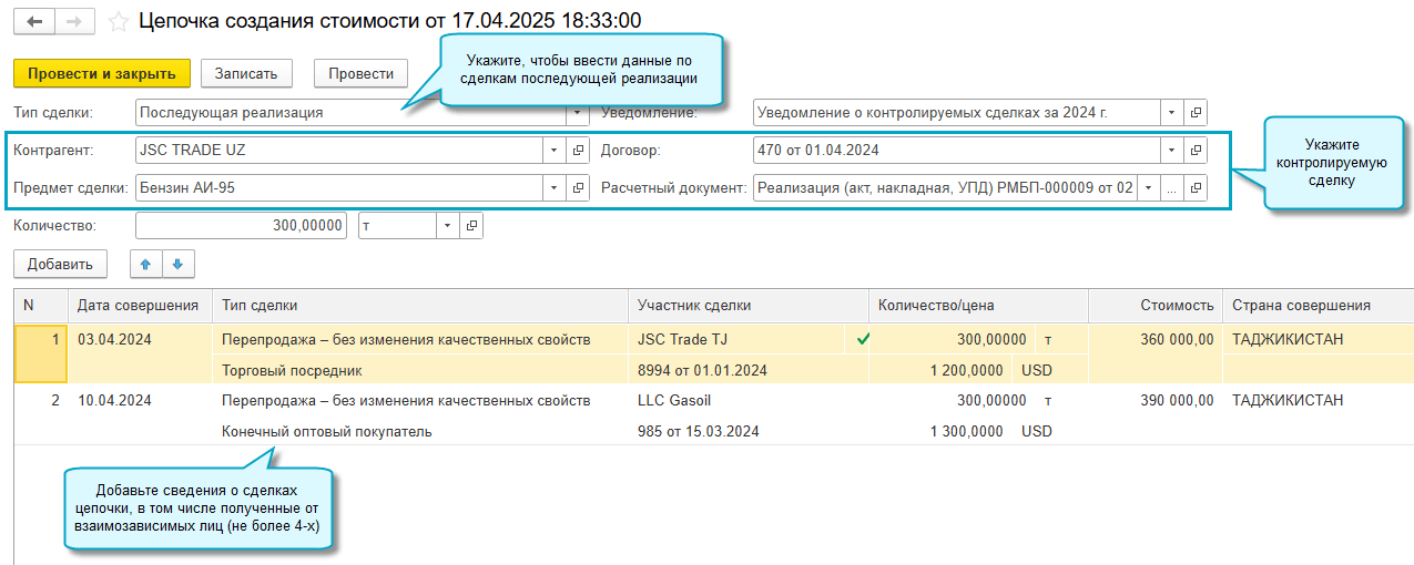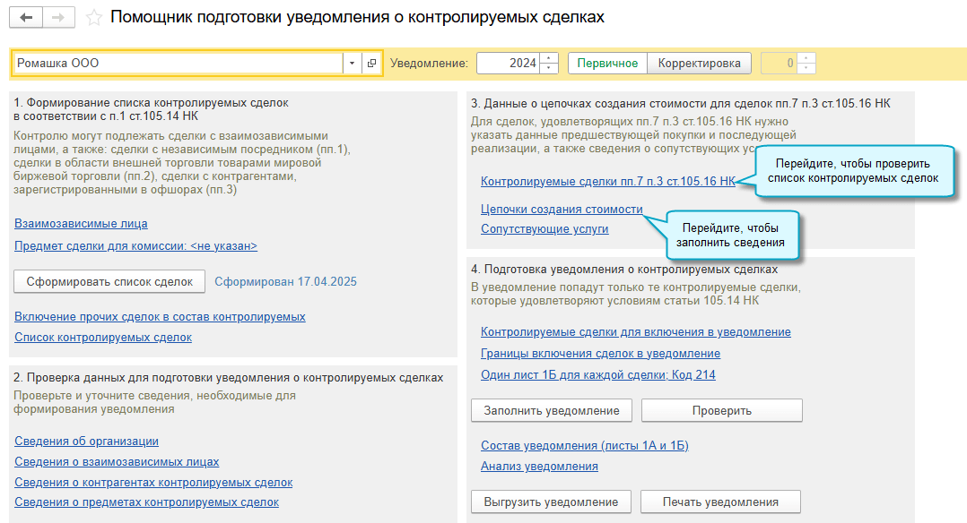 Добавлен этап по вводу данных о цепочках создания стоимости для сделок по пп.7 п.3 ст.106 НК в помощник подготовки уведомления о контролируемых сделках. Введенные сведения о сделках последующей реализации, предшествующей покупки товаров и сопутствующих услугах сохраняются, при перезаполнении уведомления на следующем этапе подготовки не удаляются.