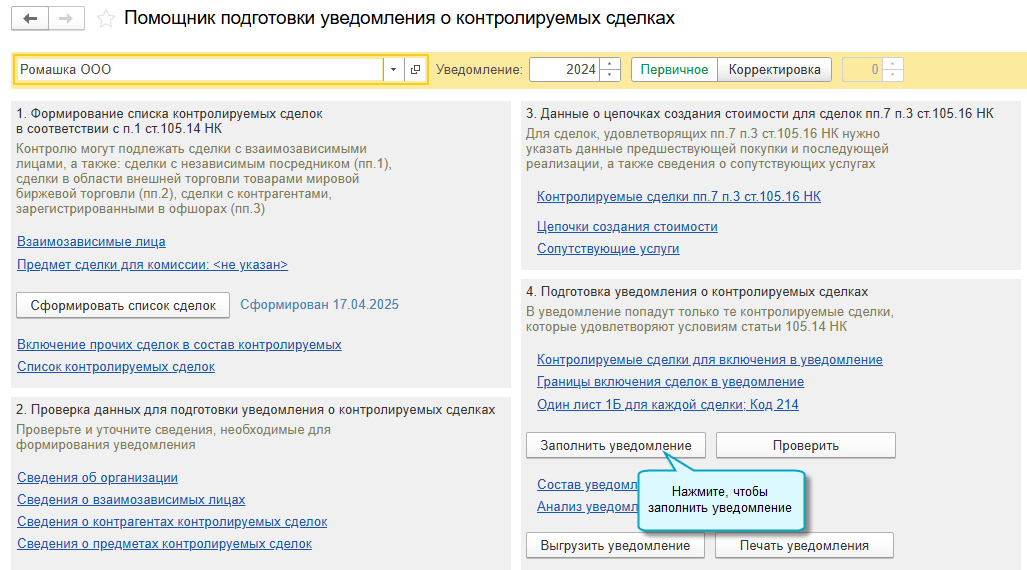 Полный интерфейс: меню "Отчеты - Контролируемые сделки - Помощник подготовки уведомления".