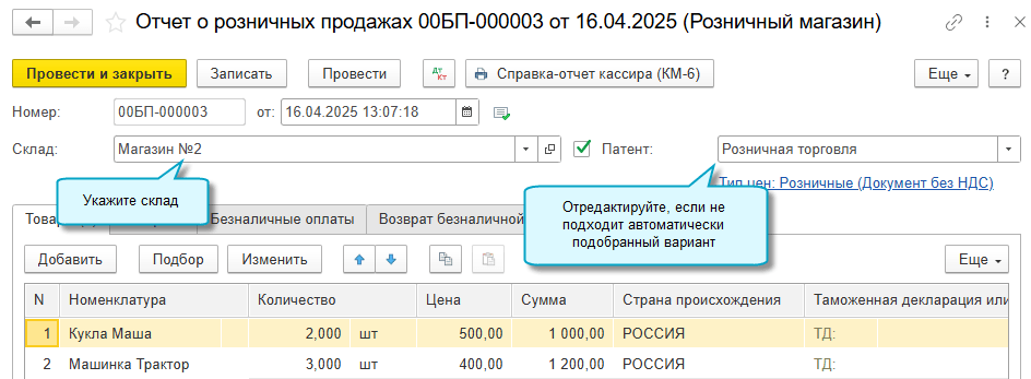 Добавлен автоматический подбор патента в документы "Отчет о розничных продажах" и "Реализация товаров".
