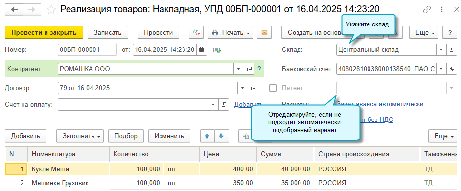 Подробнее об объемно-сортовом учете на примере молочной продукции см. здесь, об отправке покупателю УПД при объемно-сортовом учете без проверки и подбора товаров см. здесь.