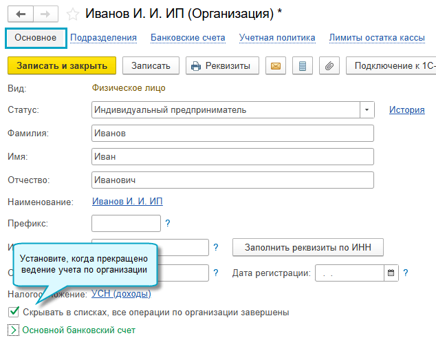 Добавлена возможность скрывать неактуальные организации при выборе организации в документах, отчетах, задачах организации и календаре отчетности. Используйте эту возможность, чтобы скрывать организации, по которым все операции завершены и прекращено ведение учета.