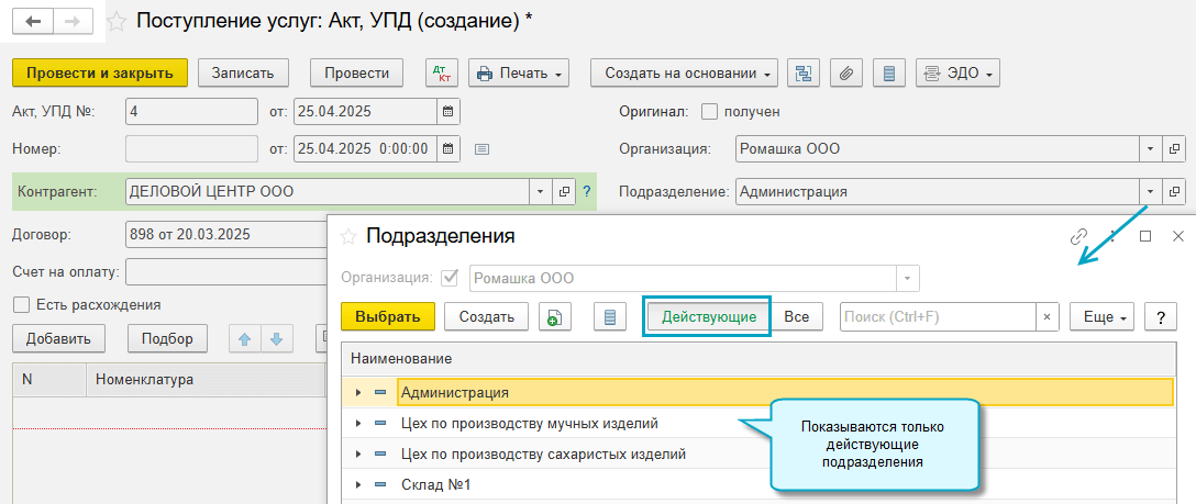 Добавлена возможность показывать только действующие подразделения организации при их выборе в документах и отчетах. Для этого достаточно помечать расформированные подразделения.