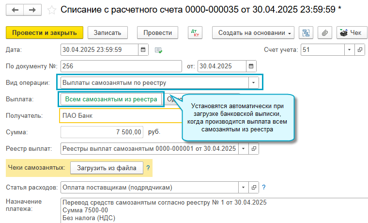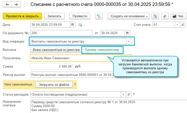 В документах "Списание с расчетного счета" по оплате реестров теперь используется один вид операции "Выплаты самозанятым по реестру" . А чтобы различать, производятся выплаты всем самозанятым из реестра или одному, добавлен переключатель.
