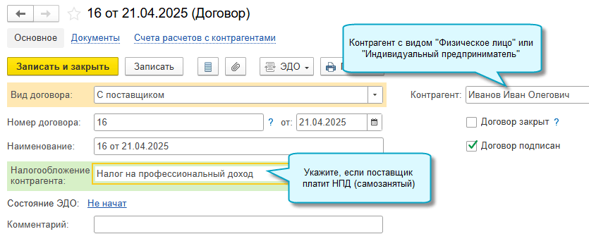 Уточнен перечень видов контрагентов. Вместо вида контрагента "Самозанятый" используйте "Индивидуальный предприниматель" или "Физическое лицо" в зависимости от статуса физического лица. Если поставщик уплачивает налог на профессиональный доход (НПД), то укажите это в договоре.