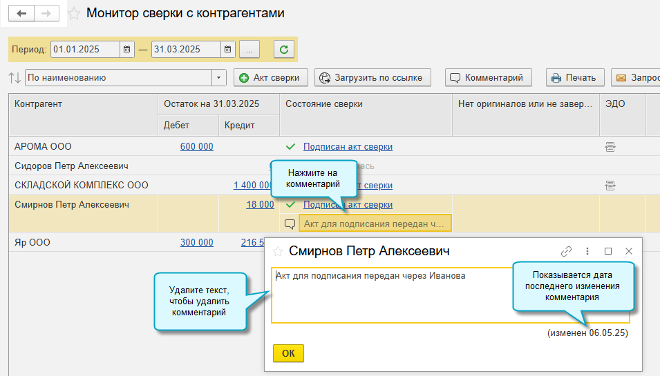 Теперь можно добавлять комментарий по контрагенту в мониторе сверки.