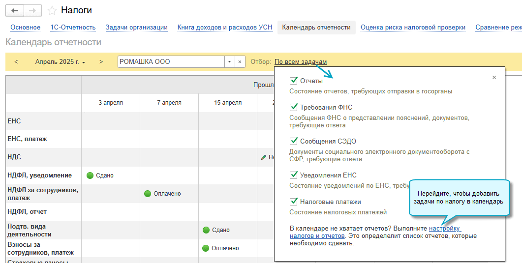 Теперь удобнее управлять набором задач по налогам в календаре отчетности. Добавлена возможность из календаря отчетности перейти к настройке налогов и отчетов. После изменения настроек календарь автоматически обновляется.