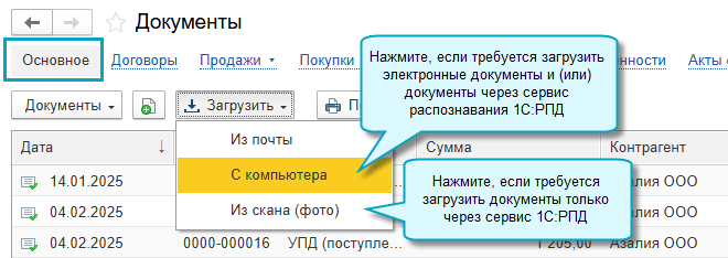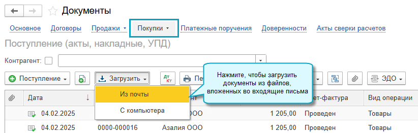 Загрузка документов доступна в журналах документов Поступление (акты, накладные, УПД), Счета от поставщиков, Платежные поручения, а в простом интерфейсе еще и из общего журнала Документы.