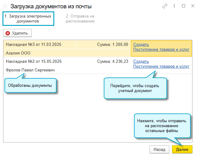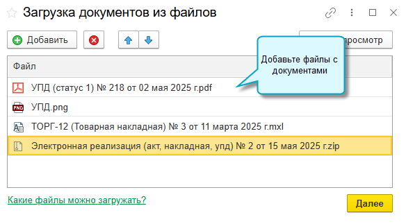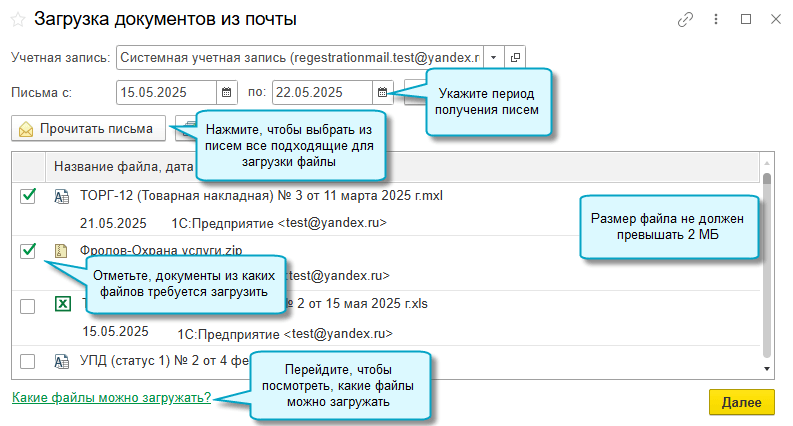 При загрузке из почты обрабатываются вложенные в письма файлы всех подходящих форматов. Формат документа определяется автоматически. Сначала как раньше загружаются ТОРГ-12 и УПД из файлов с расширением xls, xlsx и mxl, а также файлов в формате, утвержденном ФНС. Остальные файлы загружаются с помощью сервиса 1С:Распознавание первичных документов (1С:РПД), если он подключен.
