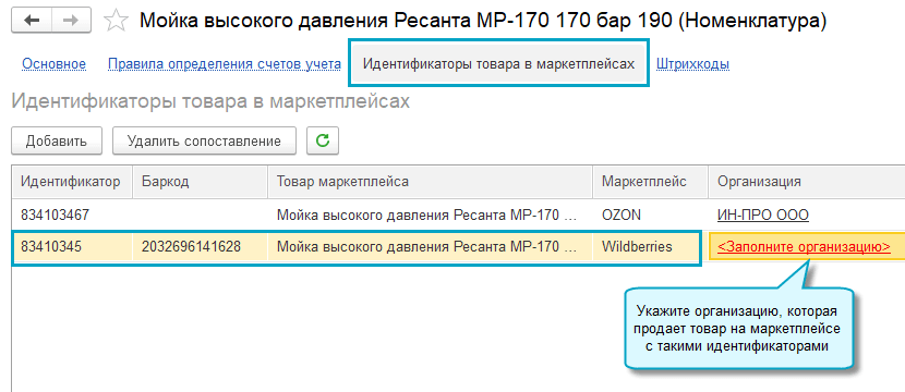 При загрузке каталога товаров маркетплейса теперь заполняется организация, которая продает товар на маркетплейсе, когда в базе ведется учет нескольких организаций. Если ранее загружались каталоги, то рекомендуется указать организацию вручную. Это используется при передаче данных об остатках организации на маркетплейсы.