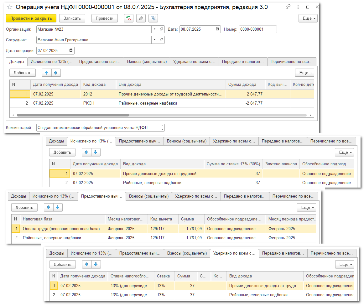 - Проводим созданные обработкой документы «Операция учета НДФЛ».