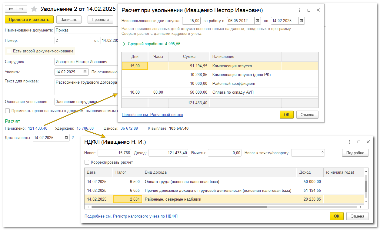 В документе "Увольнение" сотруднику Иващенко Н. И. начислено: