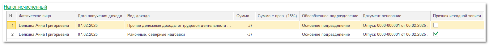 На вкладке "Физические лица" по каждому сотруднику предварительно будут заполнены табличные части "Сведения о доходах", "Предоставленные вычеты", "Налог исчисленный", "Налог удержанный", в которых соответствующие суммы доходов, вычетов, исчисленного и удержанного налога переносятся с базы "Районные, северные надбавки" на "основную" налоговую базу.