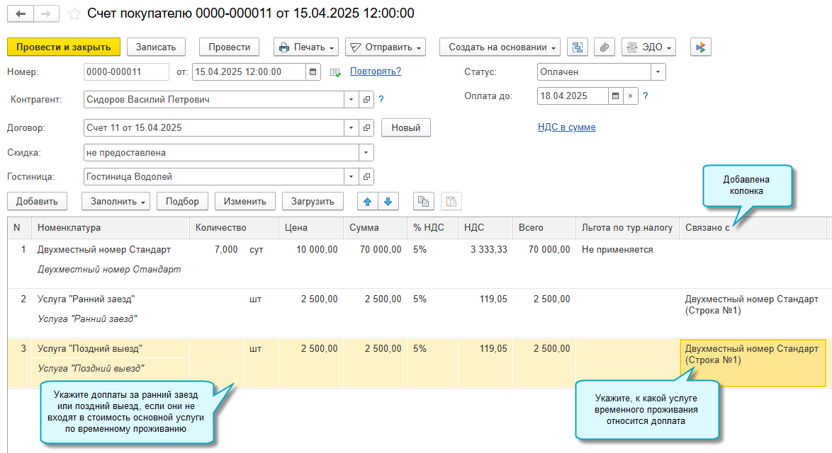 Добавлена возможность рассчитать туристический налог, когда отдельно от услуги временного проживания за сутки оплачивается ранний заезд или поздний выезд.