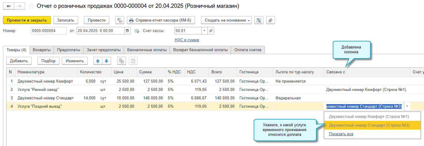 Если доплата внесена после оплаты основной услуги по временному проживанию, то для пересчета налога используйте документ Начисление туристического налога. С его помощью корректно рассчитается налог, если все оплаты прошли в одном квартале.