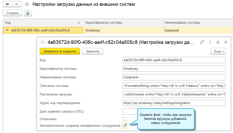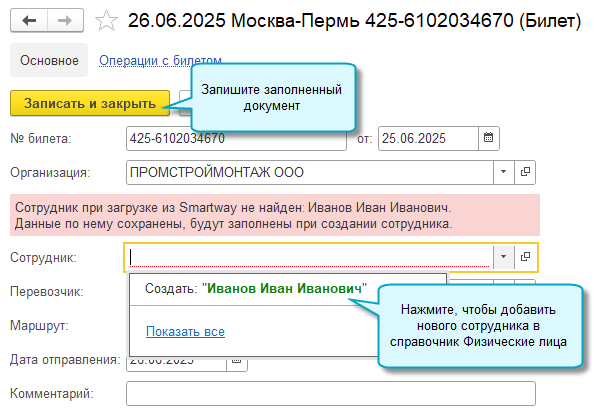 Добавлена возможность отключить автоматическое создание новых сотрудников при загрузке билетов из сервиса Smartway. Если при загрузке сотрудник не будет найден, то он не заполняется в билете и документ поступления билета не проводится. Это может пригодиться, когда часто билеты приобретаются до трудоустройства новых сотрудников.