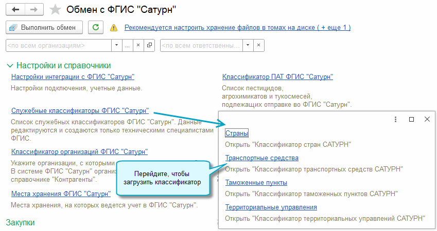Полный интерфейс: меню "Администрирование - Сервис - Обмен с ФГИС "Сатурн" - Закупки".