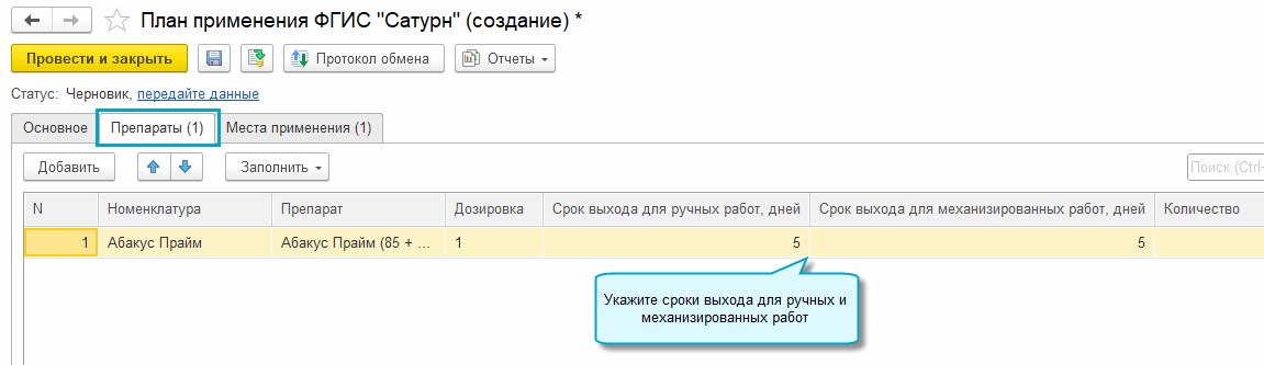 Полный интерфейс: меню "Администрирование - Сервис - Обмен с ФГИС "Сатурн" - Склад - Планы применения ФГИС "Сатурн".