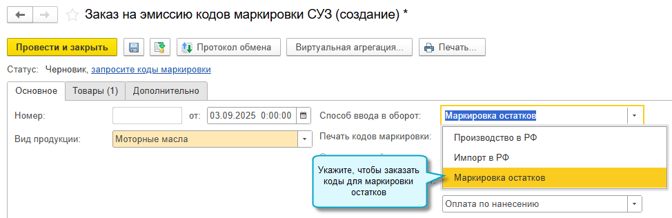 Заказ кодов маркировки на остатки осуществляется документом "Заказ на эмиссию кодов маркировки СУЗ".
