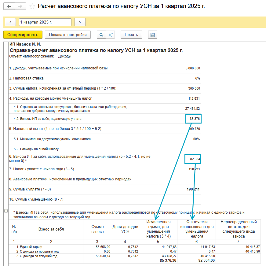 Добавлена расшифровка страховых взносов ИП за себя, использованных для уменьшения налога УСН.