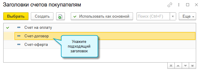 Добавлена возможность указать, с каким заголовком распечатать счет покупателю: счет на оплату, счет-оферта, счет-договор или другой вариант. Выбранный заголовок заполняется потом в УПД в основании передачи, если в нем требуется указать счет.