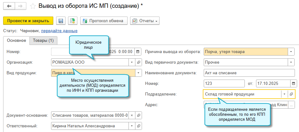 Для юридических лиц МОД определяется по ИНН и КПП, а если товар обособленного подразделения, то используется его КПП. Для индивидуальных предпринимателей МОД определяется по адресу.