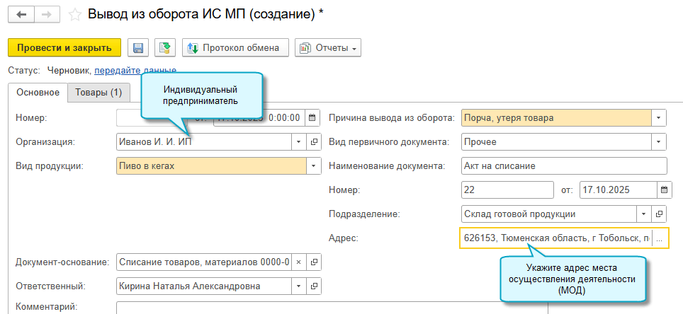 При выводе из оборота пива и ветеринарных препаратов в ГИС МТ теперь передаются сведения о месте осуществления деятельности (МОД).