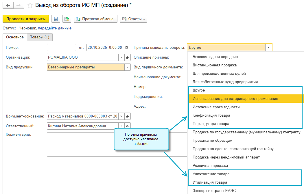 Добавлена возможность передавать в ГИС МТ "Честный знак" данные о частичном выбытии товаров из группы Ветеринарные препараты.