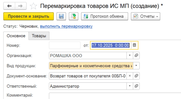 Полный интерфейс: меню "Администрирование - Сервис - Обмен с ИС МП (обувь, одежда, табак...) - Склад - Перемаркировка товаров ИС МП".