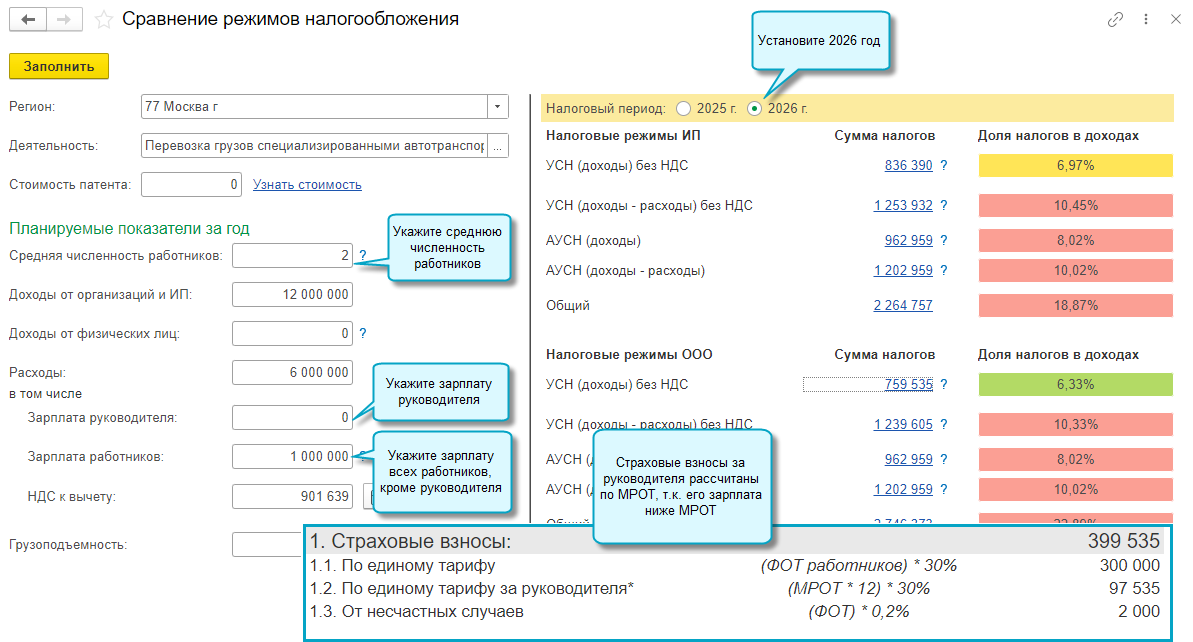 Поддержано доначисление базы для расчета страховых взносов за руководителя до уровня МРОТ (Федеральный закон от 28.11.2025 № 425-ФЗ) в обработке Сравнение режимов налогообложения. Для тех случаев, когда расчет производится для 2026 года и зарплата руководителя ниже МРОТ. Этот порядок применяется для общей и упрощенной системы налогообложения.
