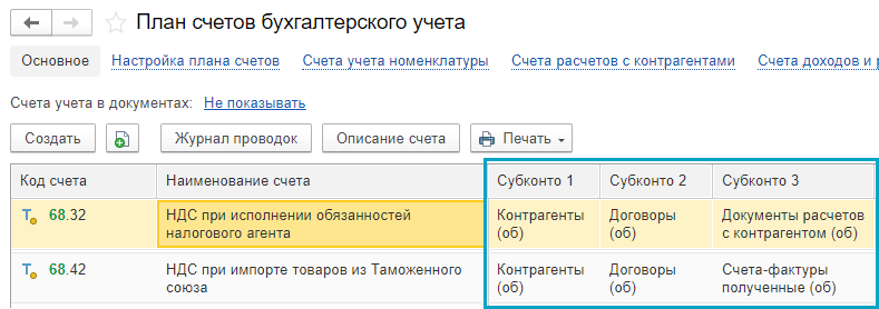 Теперь на счетах 68.32 "НДС при исполнении обязанностей налогового агента" и 68.42 "НДС при импорте товаров из Таможенного союза" учитываются только обороты по всем субконто. Хранение остатков на этих счетах не требуется, т.к. с 2023 года уплата НДС при исполнении обязанностей налогового агента и НДС при импорте товаров из Таможенного союза производится в составе единого налогового платежа.