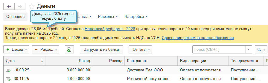 Добавлено предупреждение о приближении к порогу применения патента и УСН без НДС с 2026 года (Федеральный закон от 28.11.2025 № 425-ФЗ).