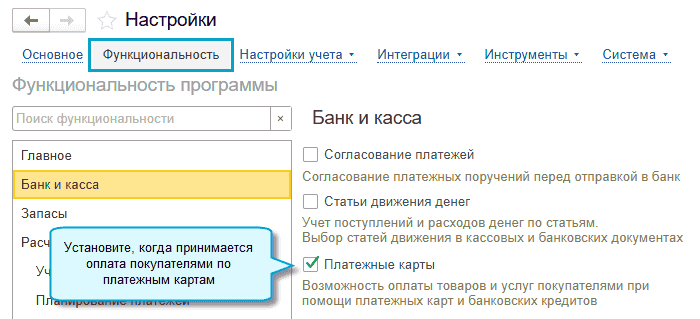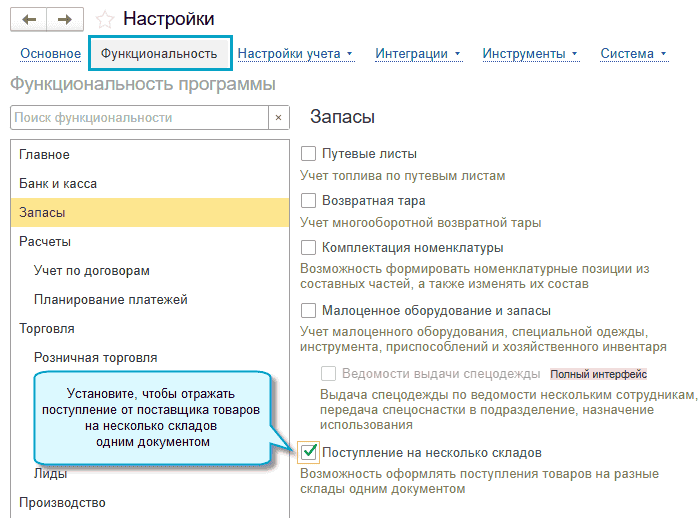 Полный интерфейс: меню "Главное - Настройки - Функциональность - Запасы".